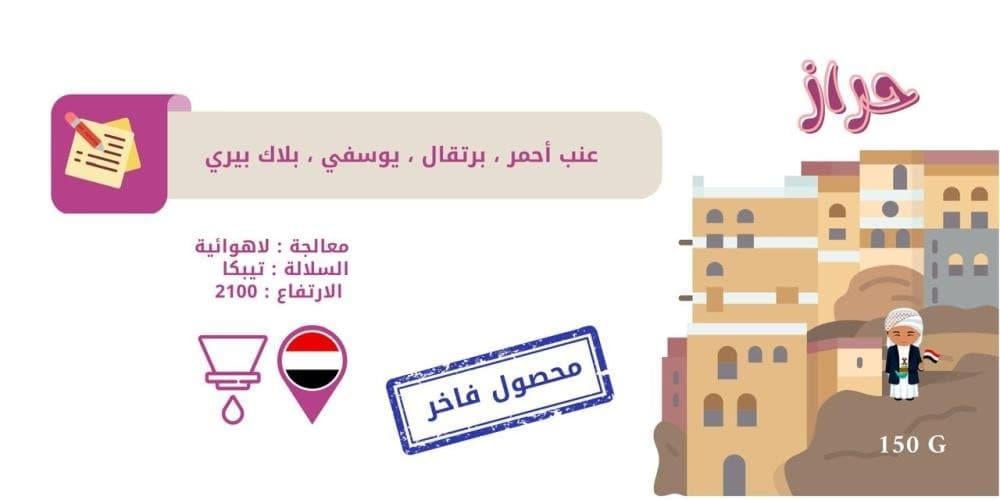 إذا كنت من عشاق القهوة المختصة، فإن هذا المحصول اليمني الفاخر سيأسر حواسك بتوازنه المثالي بين الحلاوة الطبيعية والحمضية الفاكهية، مدعومًا بلمسات بهارية تمنحه طابعًا فريدًا. تمت زراعة هذا البن في منطقة حراز، على ارتفاع يتراوح بين 1800 إلى 2400 متر فوق سطح البحر، حيث تؤدي التربة الغنية والمناخ الفريد إلى إنتاج حبوب قهوة بجودة لا تضاهى.